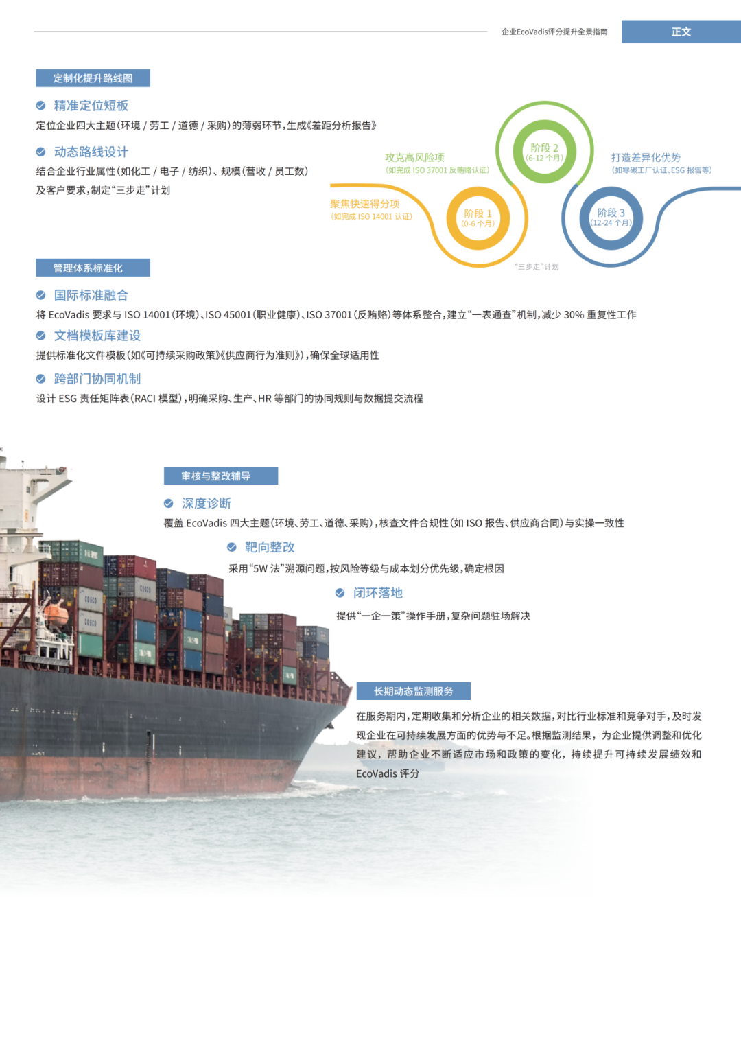 ICAS 英格爾認(rèn)證的 “3 + 1 護(hù)航服務(wù)” 通過(guò)定制化提升路線圖、管理體系標(biāo)準(zhǔn)化、審核與整改輔導(dǎo)以及長(zhǎng)期動(dòng)態(tài)監(jiān)測(cè)服務(wù),幫助企業(yè)快速提升 EcoVadis 評(píng)分。在時(shí)間緊迫的項(xiàng)目中,優(yōu)化流程、精準(zhǔn)施策,顯著縮短提升周期,助力企業(yè)搶占市場(chǎng)先機(jī)。