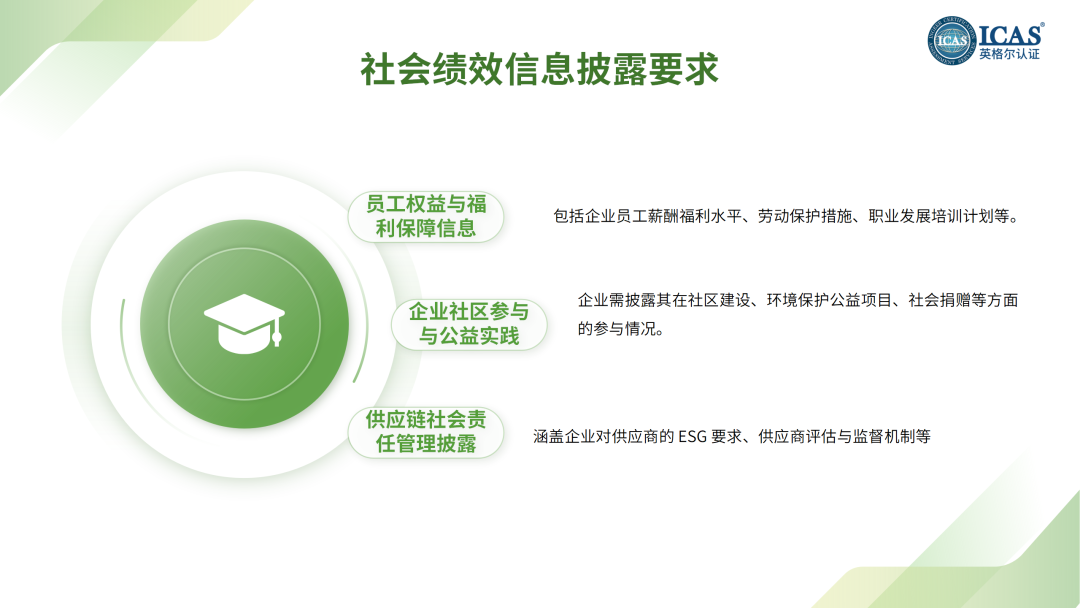 社會(huì)績效信息披露,要求企業(yè)披露員工薪酬福利水平、勞動(dòng)保護(hù)措施、職業(yè)發(fā)展培訓(xùn)計(jì)劃等員工權(quán)益與福利保障信息。同時(shí),企業(yè)需披露其在社區(qū)建設(shè)、環(huán)境保護(hù)公益項(xiàng)目、社會(huì)捐贈(zèng)等方面的參與情況,以及對供應(yīng)商的 ESG 要求、供應(yīng)商評估與監(jiān)督機(jī)制等供應(yīng)鏈社會(huì)責(zé)任管理披露內(nèi)容。