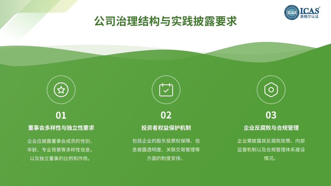 公司治理結(jié)構(gòu)與實(shí)踐披露要求企業(yè)披露董事會(huì)成員的性別、年齡、專業(yè)背景等多樣性信息,以及獨(dú)立董事的比例和作用。此外,企業(yè)需披露其反腐敗政策、內(nèi)部監(jiān)督機(jī)制以及合規(guī)管理體系建設(shè)情況,同時(shí)保障股東投票權(quán)、提高信息披露透明度、加強(qiáng)關(guān)聯(lián)交易管理,以保護(hù)投資者權(quán)益。