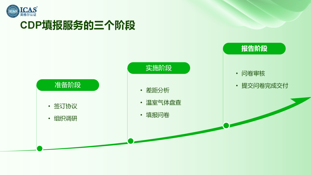 在 CDP 填報過程中,ICAS英格爾認證的服務分為三個階段:首先是差距分析和協助企業(yè)進行溫室氣體盤查,通過深入調研企業(yè)的碳排放情況,識別與 CDP 填報要求的差距,為企業(yè)制定個性化的填報策略;
