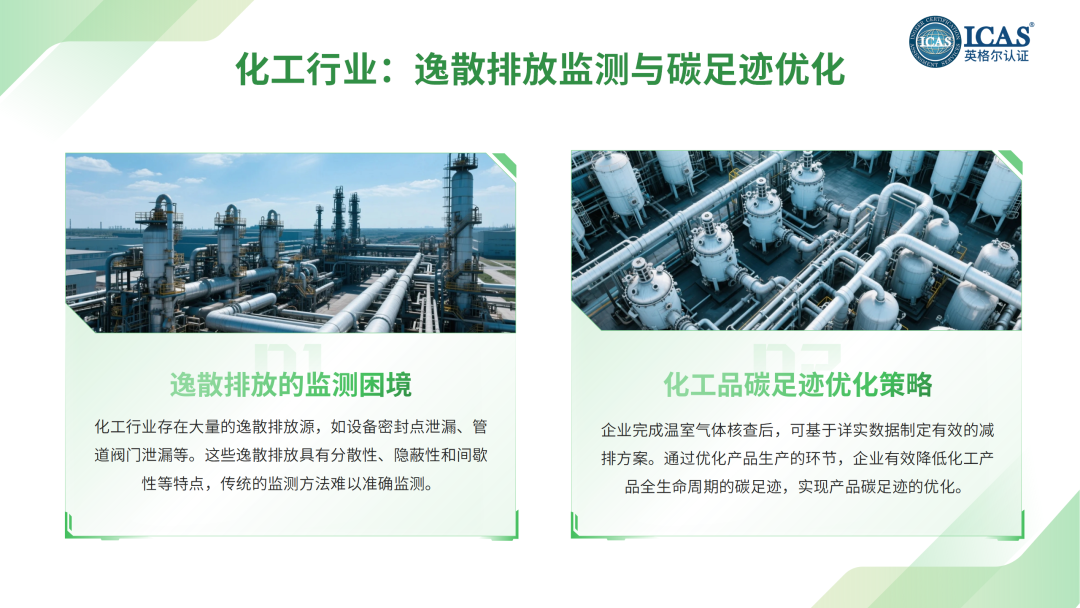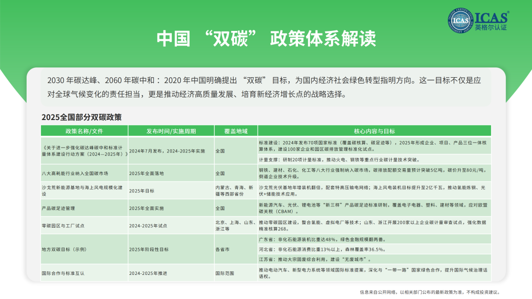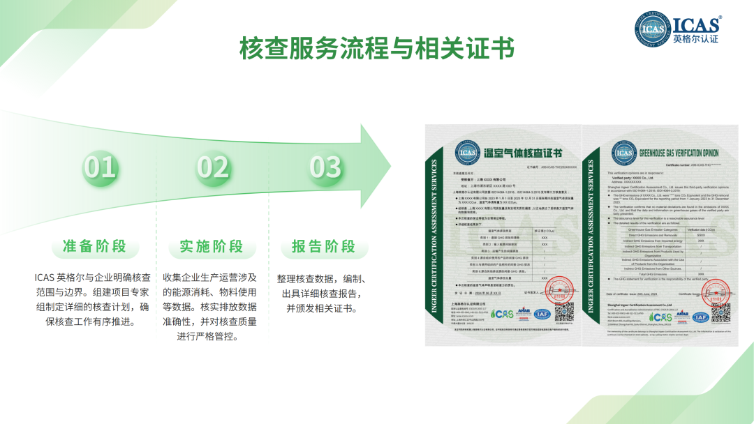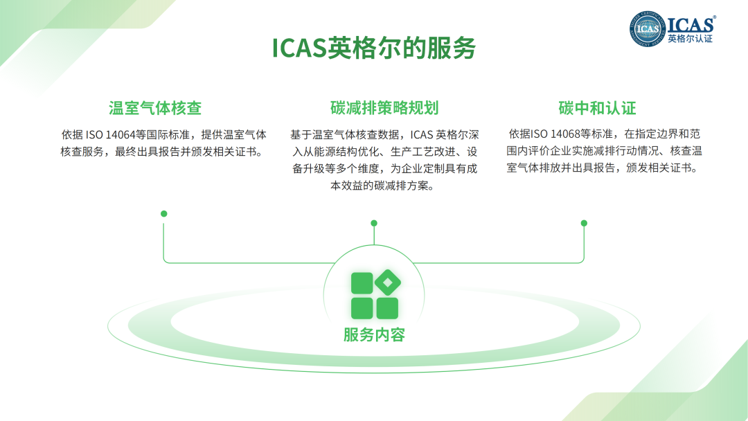 在中國“雙碳”政策引領下,溫室氣體的盤查與第三方核查貫穿相關企業綠色轉型全鏈條,ICAS 英格爾認證,為企業提供全面高效的一站式服務,助力企業打造低碳標桿,進一步推動綠色轉型,增強國際競爭力。