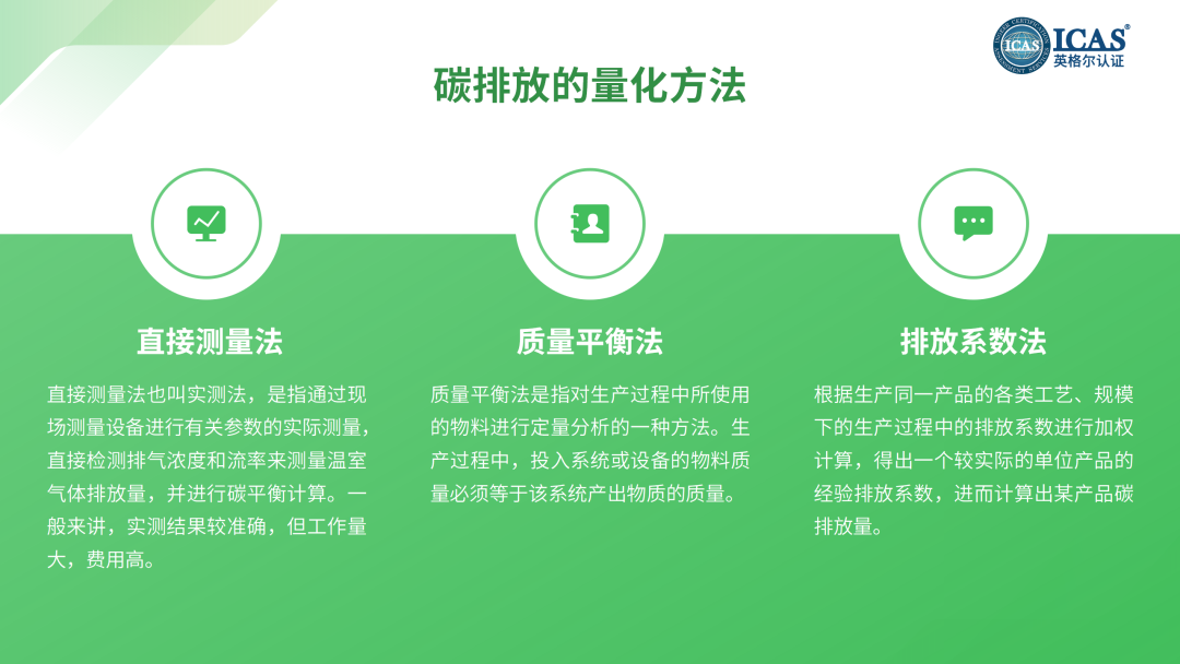 溫室氣體核查是企業綠色轉型的基礎工作,其方法主要包括直接測量法、質量平衡法和排放系數法/排放因子法。直接測量法通過現場測量設備進行實際測量,結果較為準確,但工作量大、費用高;質量平衡法對生產過程中所使用的物料進行定量分析,適用于物料流轉清晰的生產環節;排放系數法則根據經驗排放系數計算產品碳排放量,適用于數據收集困難的場景。