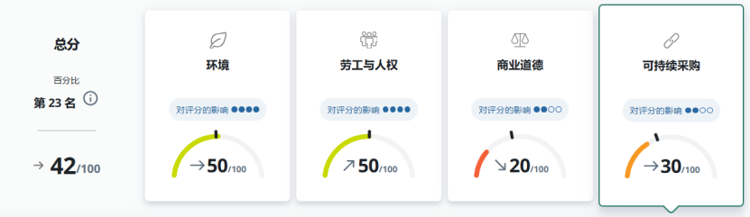 此次服務的客戶為全球新能源電池領域的頭部企業(yè),首次EcoVadis評分為42分,目標是在6個月內(nèi)沖刺到65分。初步評估顯示,其在環(huán)境管理維度表現(xiàn)突出,但商業(yè)道德與可持續(xù)采購存在部分短板,而這些短板成為評分提升的關鍵瓶頸。