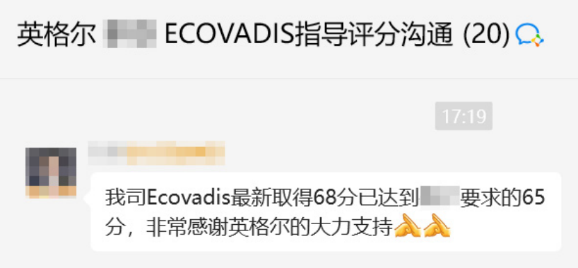 客戶在ICAS英格爾 EcoVadis指導評分溝通群中分享喜訊:“我司 EcoVadis 最新取得 68 分,已達到要求的 65 分,非常感謝ICAS英格爾認證的大力支持!” 簡單的話語,卻飽含著客戶對我們的高度認可之情。