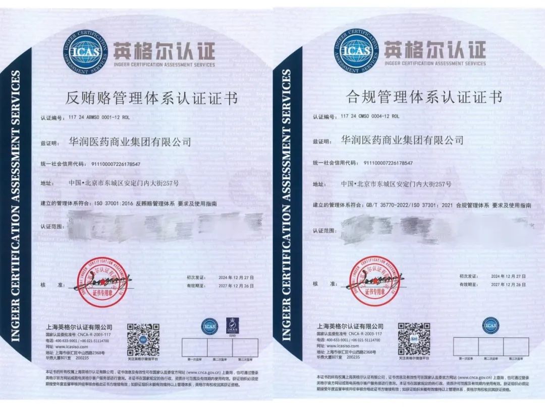 ISO 37301:2021與ISO 37001:2016是國際公認的合規與反賄賂管理權威標準,前者聚焦企業全面合規風險管控,后者針對商業賄賂預防與治理,雙體系認證的同步落地,彰顯了華潤醫商在治理架構、內控機制及商業道德建設領域的卓越實踐。